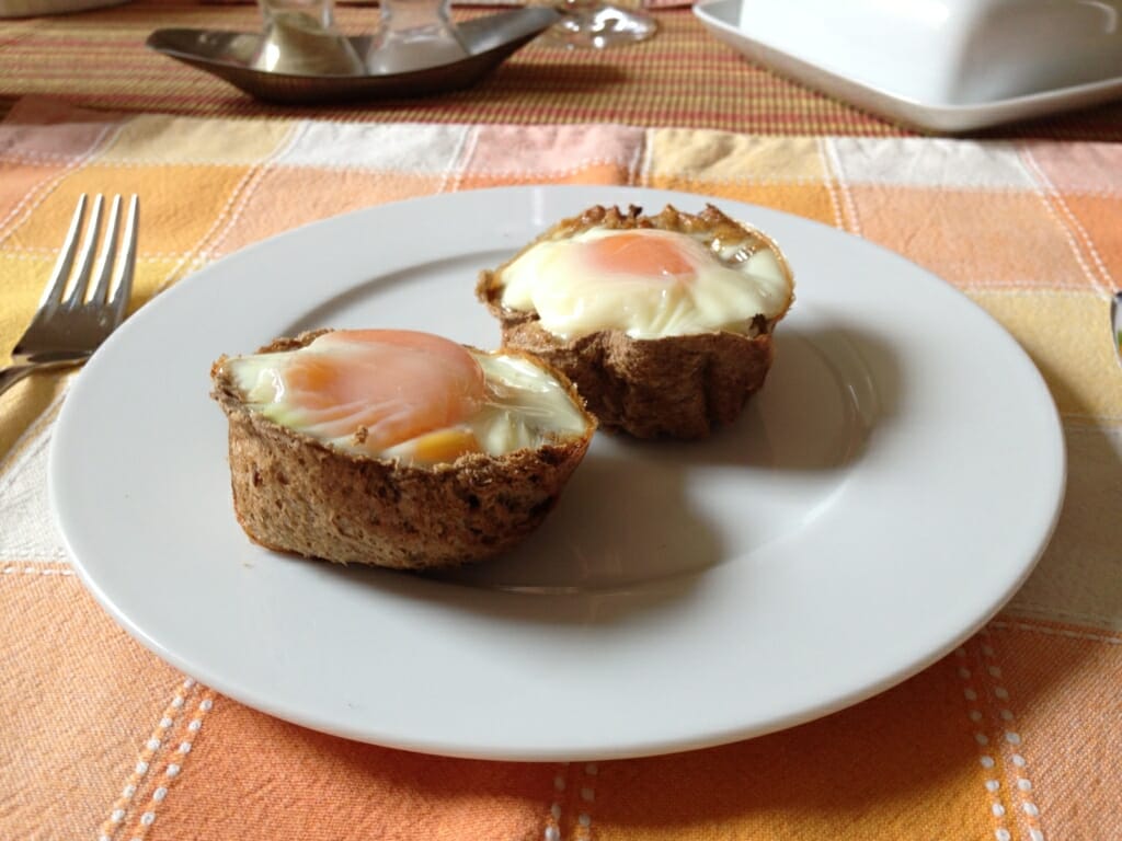 Toastbrot mit Nudelholz flachwalzen, in gebutterte Muffinform einsetzen, vorsichtig ein Ei dort einbringen (besser L als M), leicht mit Salz und Peffer von oben würzen. Im Backoffen bei 160° Heißluft knapp 15 Minuten stocken lassen.