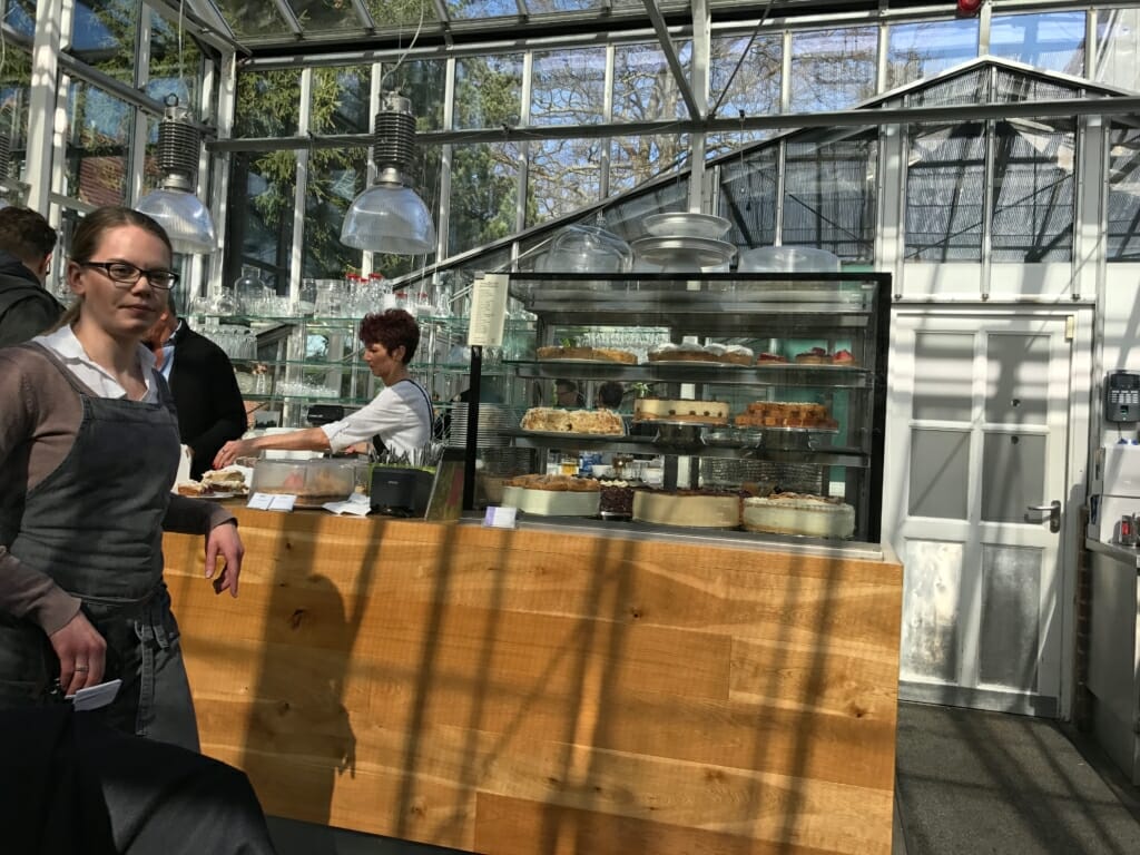 Das Café befindet sich in einem Gewächshaus und hat gefühlt riesige Ausmaße. Es leiden Unmengen an Menschen herum und suchten einen Platz. Wir hatten ja einen und suchten uns leckere Torten aus. Diese schmeckten dann auch wunderbar. Die Tortenstücke waren mit 4,40€ pro Stück nicht gerade günstig aber hey…