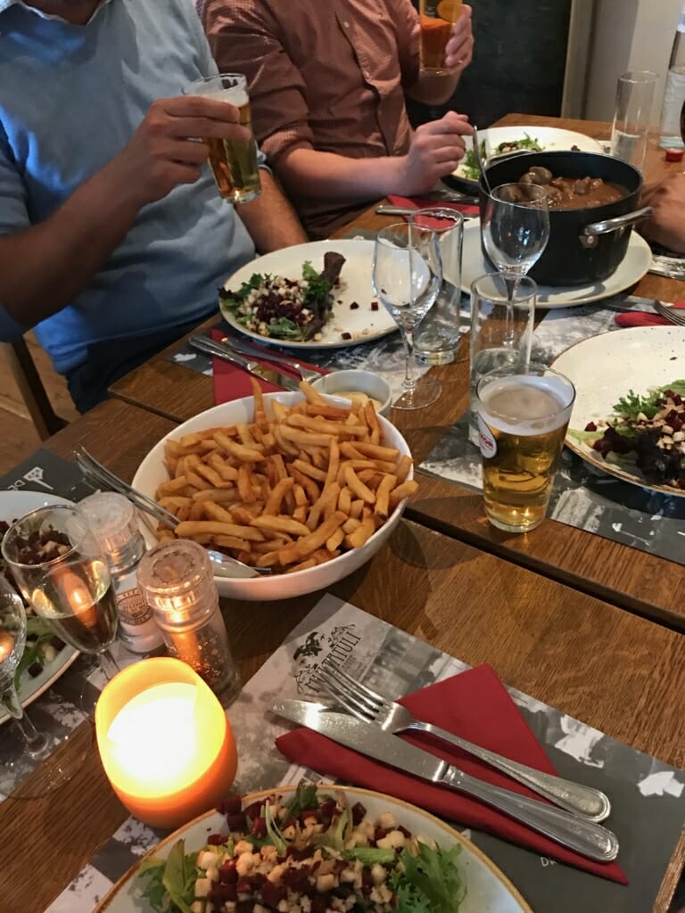 Das Essen kann als belgische Küche bezeichnet werden, bodenständig, abwechslungsreich und mit diversen Einsprenkeln internationaler Küche. Bei größeren Gruppen wird das Essen in Schüsseln auf den Tisch gebracht. Sehr schön war der Verzicht auf Hintergrundmusik, man konnte sich gut unterhalten.