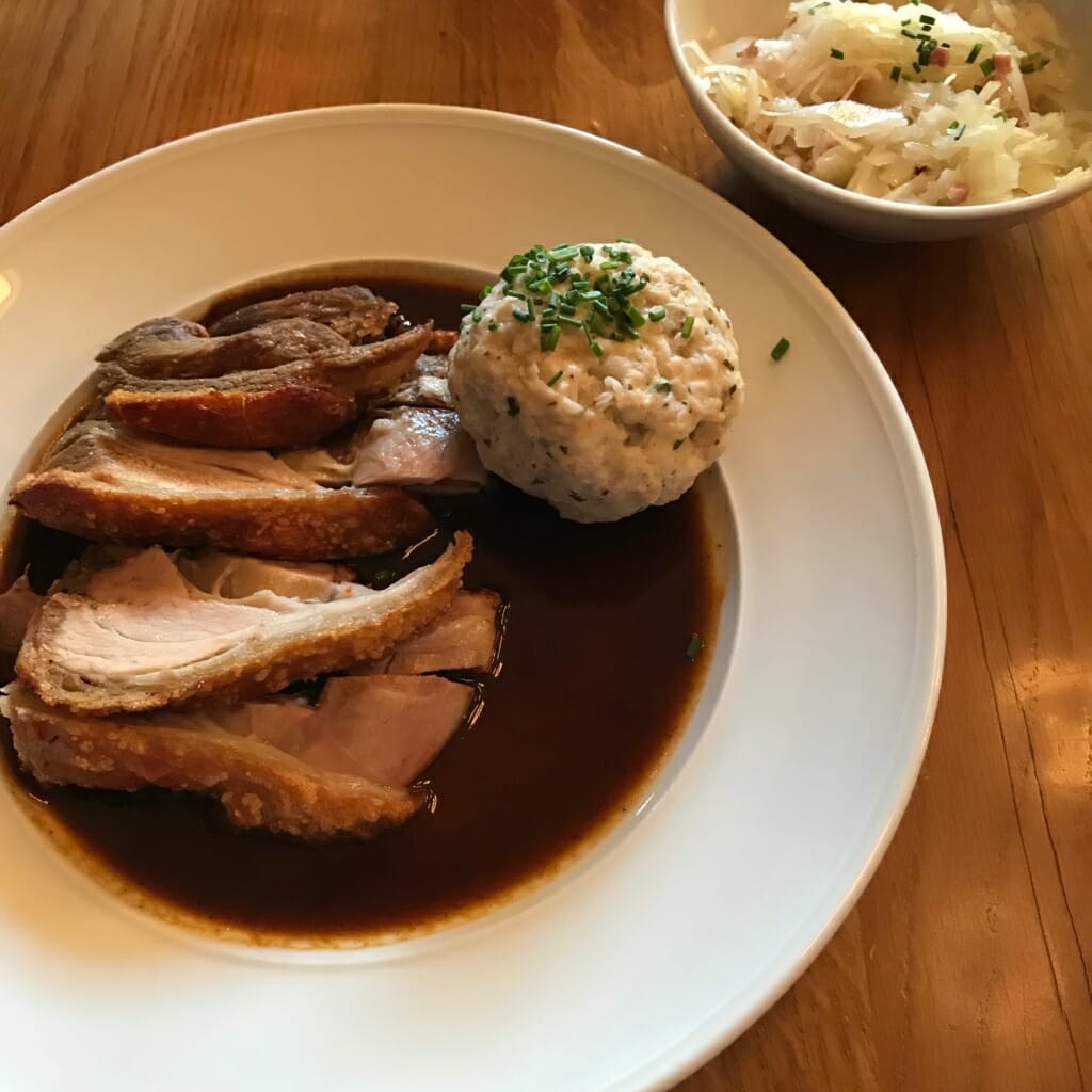 Die Karte hält die erwarteten Gerichte bereit, Weißwürste im übrigen auch nach 11 Uhr 😉 Wir hatten Schweinsbraten mit Semmelknödel und Kraut und Ofenkartoffel. Solides Essen mit Geschmack an dem es nichts auszusetzen gab.