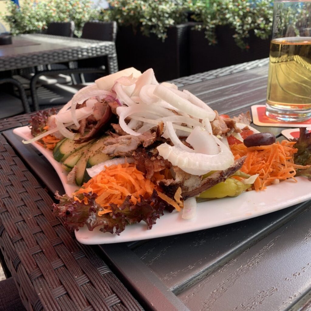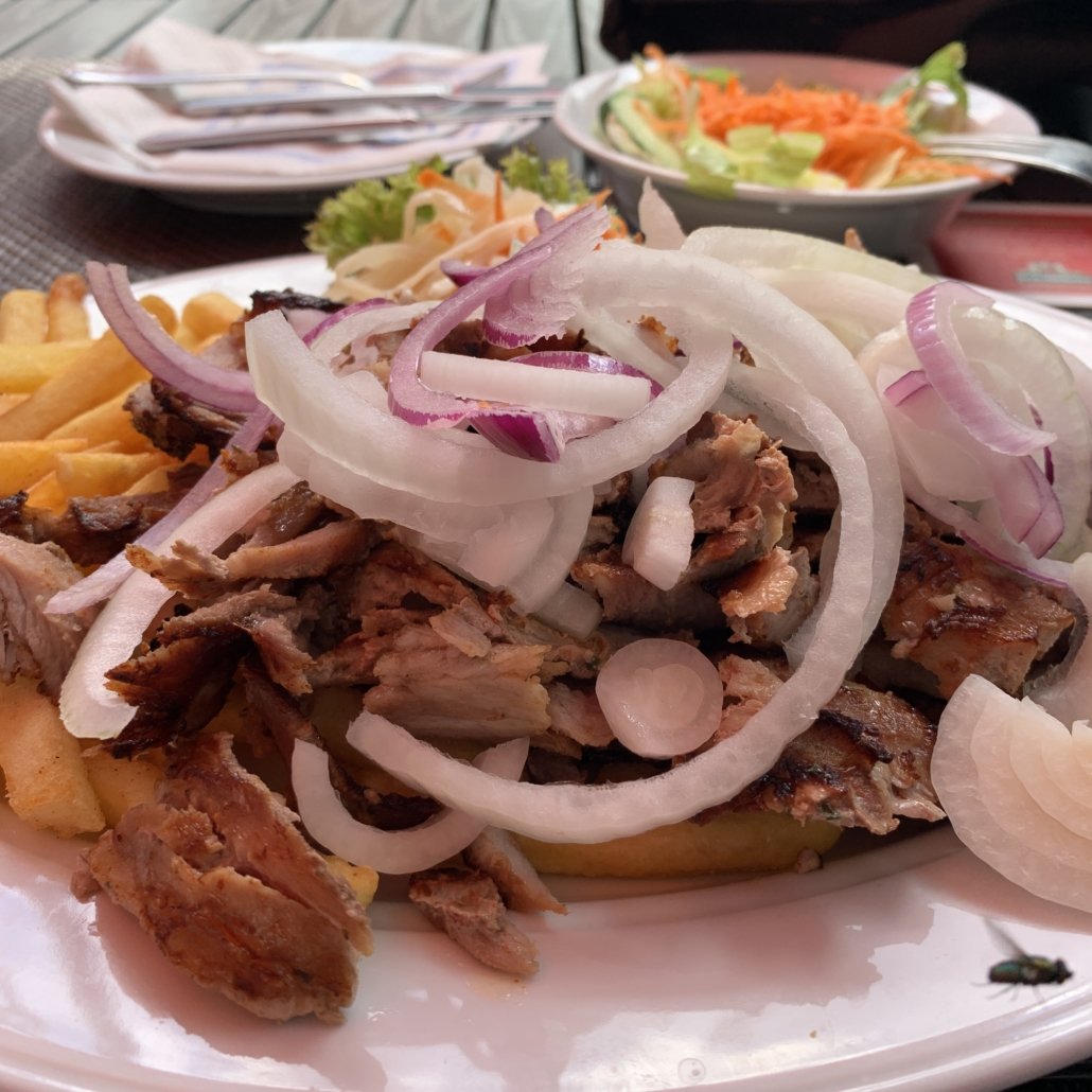 Die Speisekarte war griechentypisch voll, bot aber keine Überraschungen. Es gab auch eine kleine Mittagskarte, wir bestellten aber aus der Hauptkarte einen Salatteller und einen klassischen Gyrosteller mit Tzatziki. Die Getränke kamen zügig, das Essen nach einer Weile.