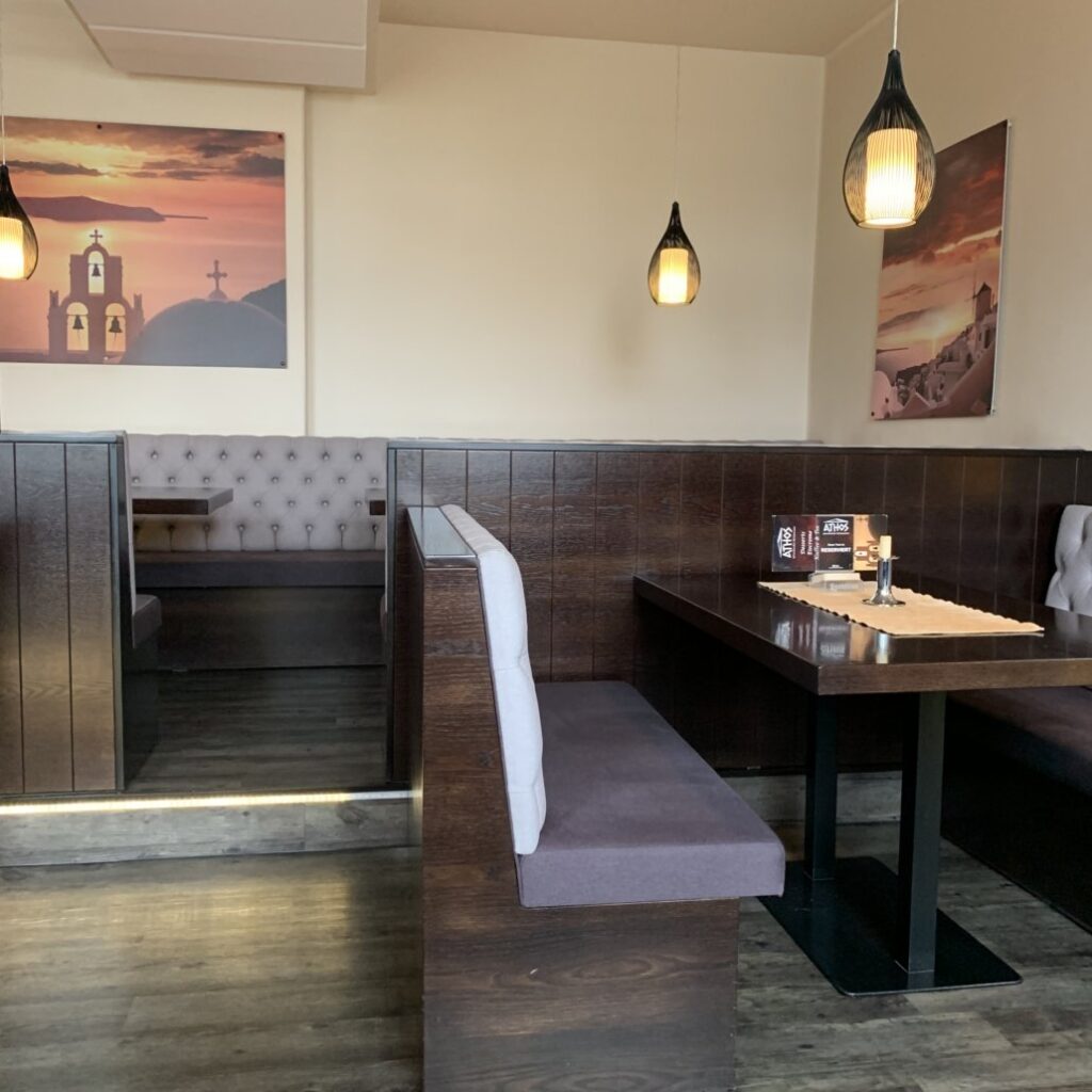 Ein Kommentar brachte uns dann ins Athos in Heidenau. Erstmal fällt mir angenehm auf das die Einrichtung zeitlos modern eingerichtet ist und auf den üblichen Kitsch verzichtet. Das Personal ist sehr freundlich ohne aufdringlich zu sein, das ist schön.