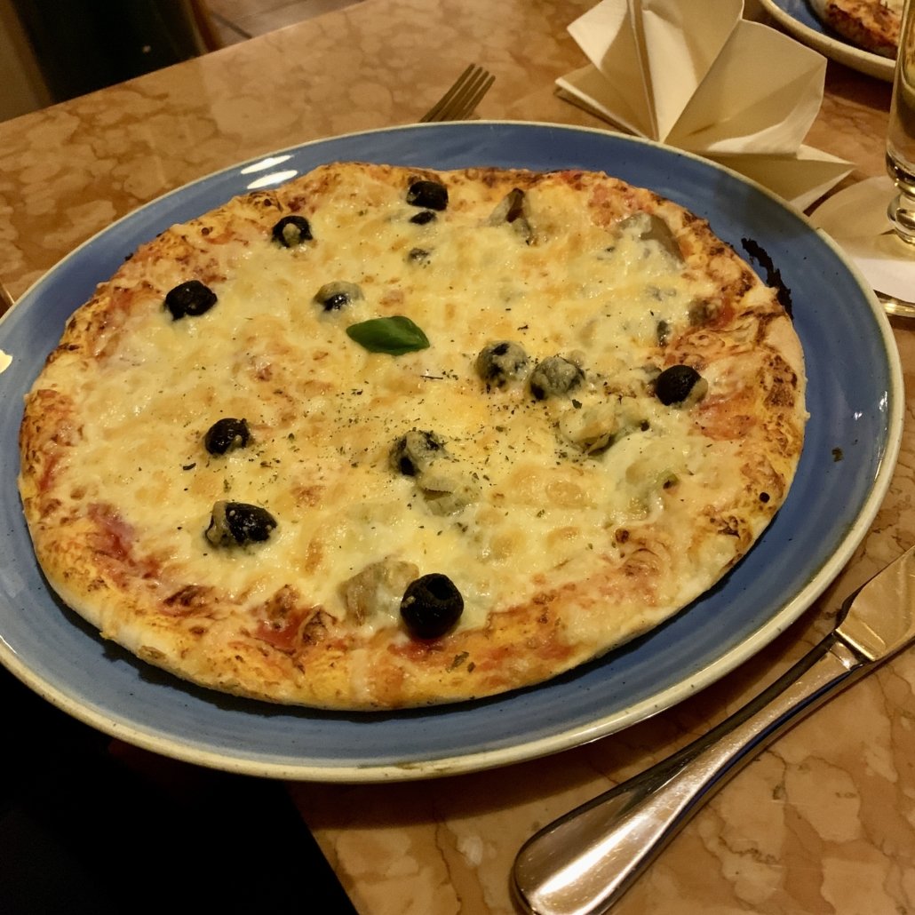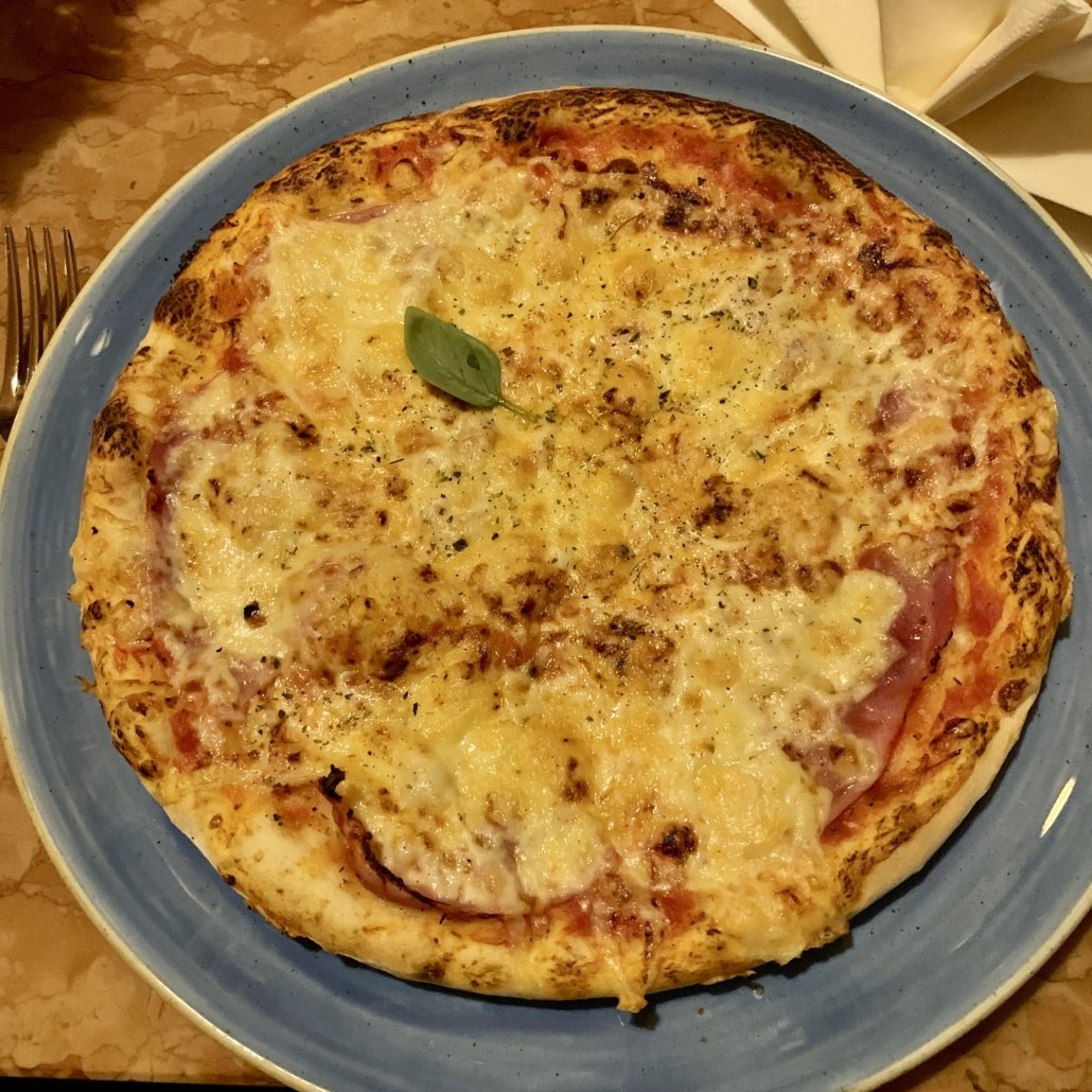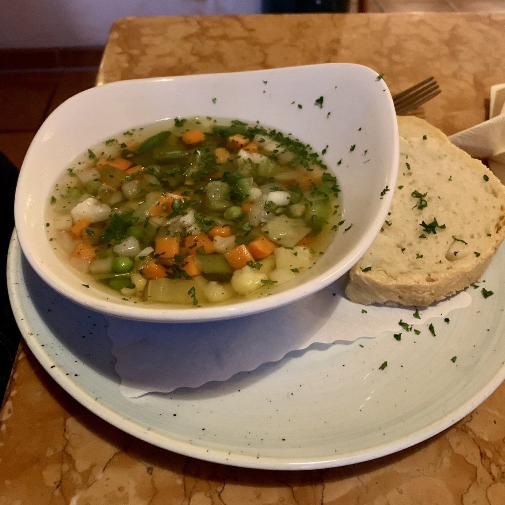 Die Räumlichkeiten sind nett gestaltet, Coronabedingt waren weniger Tische als üblich aufgestellt – eine Reservierung empfiehlt sich. Wir wurden zu unserem Tisch geführt und die Getränkebestellung wurde sofort aufgenommen. Die Karte ist umfangreich und bietet neben Pizzen in zwei verschiedenen Größen und einer guten Auswahl an Pasta auch Fleischgerichte und Salate. Wir entschieden uns für eine Minestrone, Pizzen und Spaghetti Carbonara. Auch die Pasta-Gerichte wurden in zwei verschiedenen Größen angeboten.