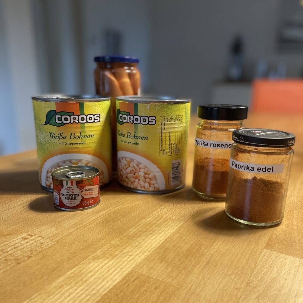 2 Dosen weiße Bohnen (ob abgetropft oder nicht ist Glaubenssache), wer mehr Zeit hat kann auch getrocknete weiße Bohnen in der gewünschten Menge verwenden. Vorher einweichen nicht vergessen.