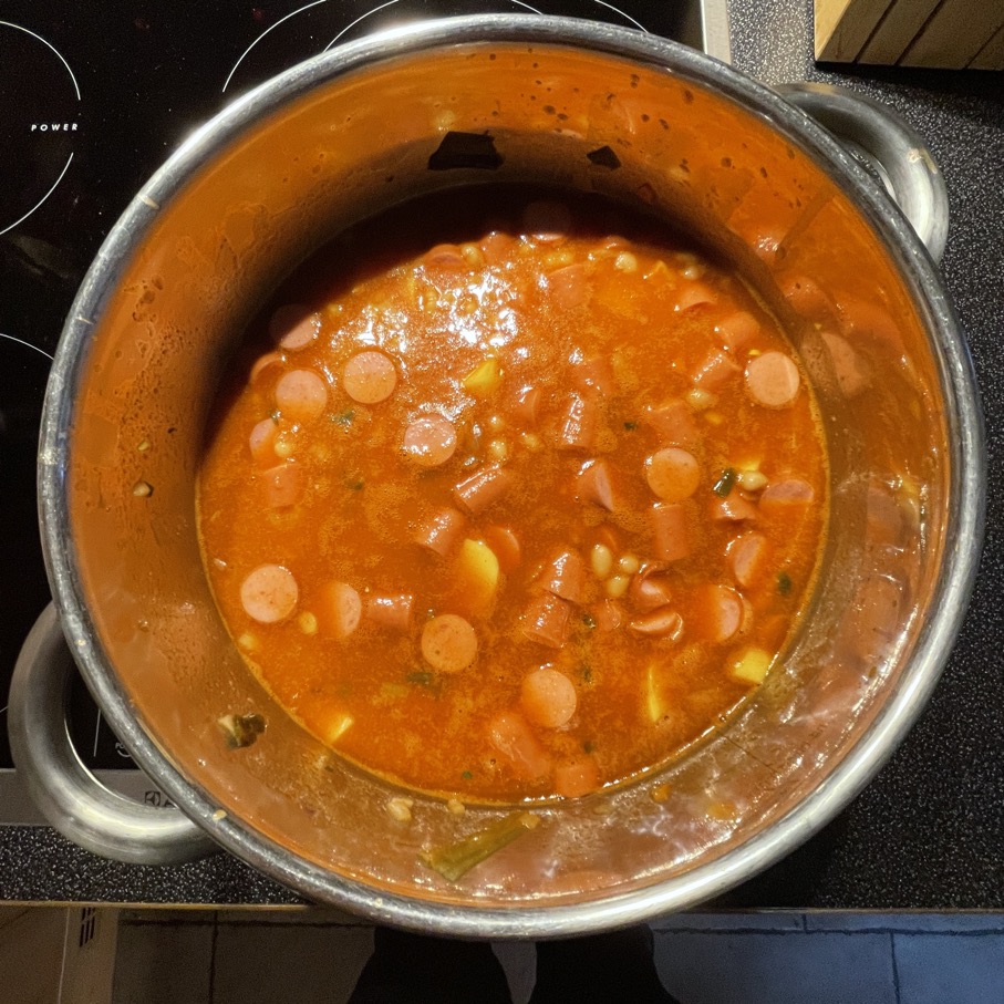 Man kann Wiener Würstchen oder Cabanossi reinschnippeln, ich habe den Eintopf auch schon mit fein gewürfelter Salami oder angebratenem Hackfleisch „aufgebrezelt“ – oder eben pur. Wem die Suppe zu scharf geraten ist, kann die Schärfe mit einem Klecks Joghurt oder ähnlichem mildern.