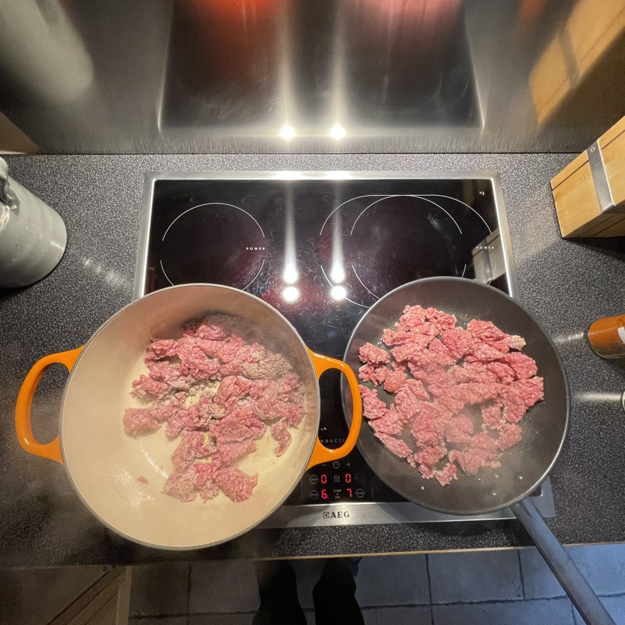 Hackfleisch anbraten mache ich am liebsten in zwei Töpfen, damit das Hackfleisch kein Wasser abgibt und Röstaroma bekommt