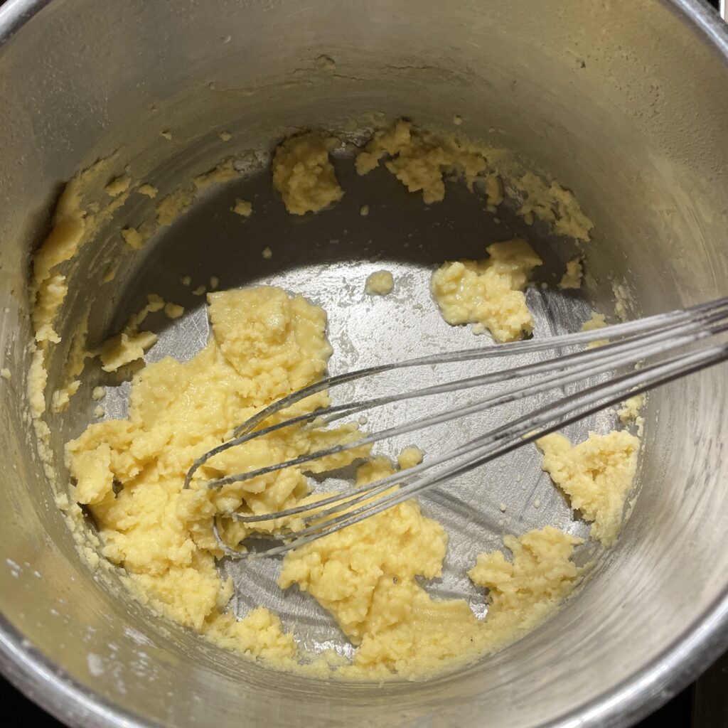 Wir bereiten zunächst eine Mehlschwitze: Butter im Topf bei mittlerer Hitze zerlassen, dann nach und nach das Mehl hinzufügen und zu einer klümpchenfreien Masse verrühren. Die Masse dann für zwei, drei Minuten rösten (einbrennen).