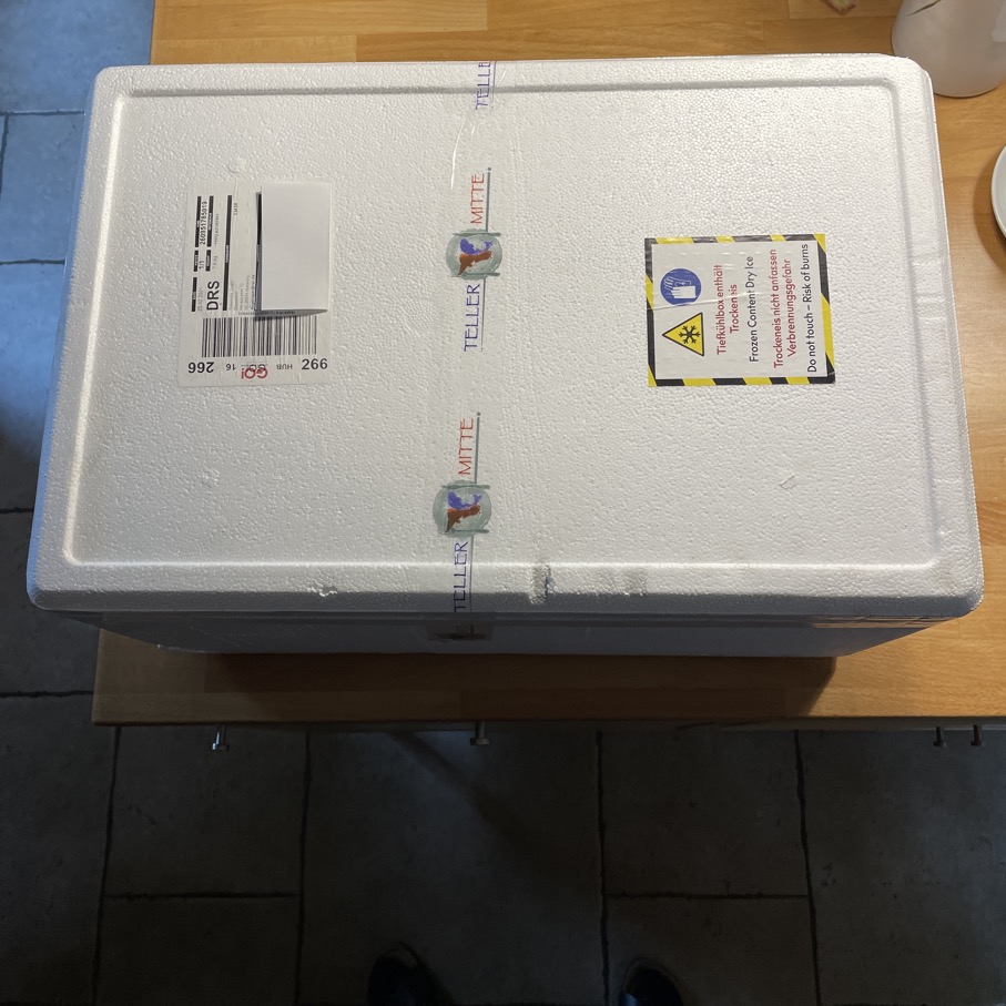 Soviel zur Theorie. Die Ware wurde in ein mit Trockeneis gekühlten Styroporkisten geliefert. Alle Produkte waren knüppelhart gefroren, das war nichts nur in der Nähe von angetaut. Sehr gut, da hatte ich bei anderen Anbieter schon mehr Stress.