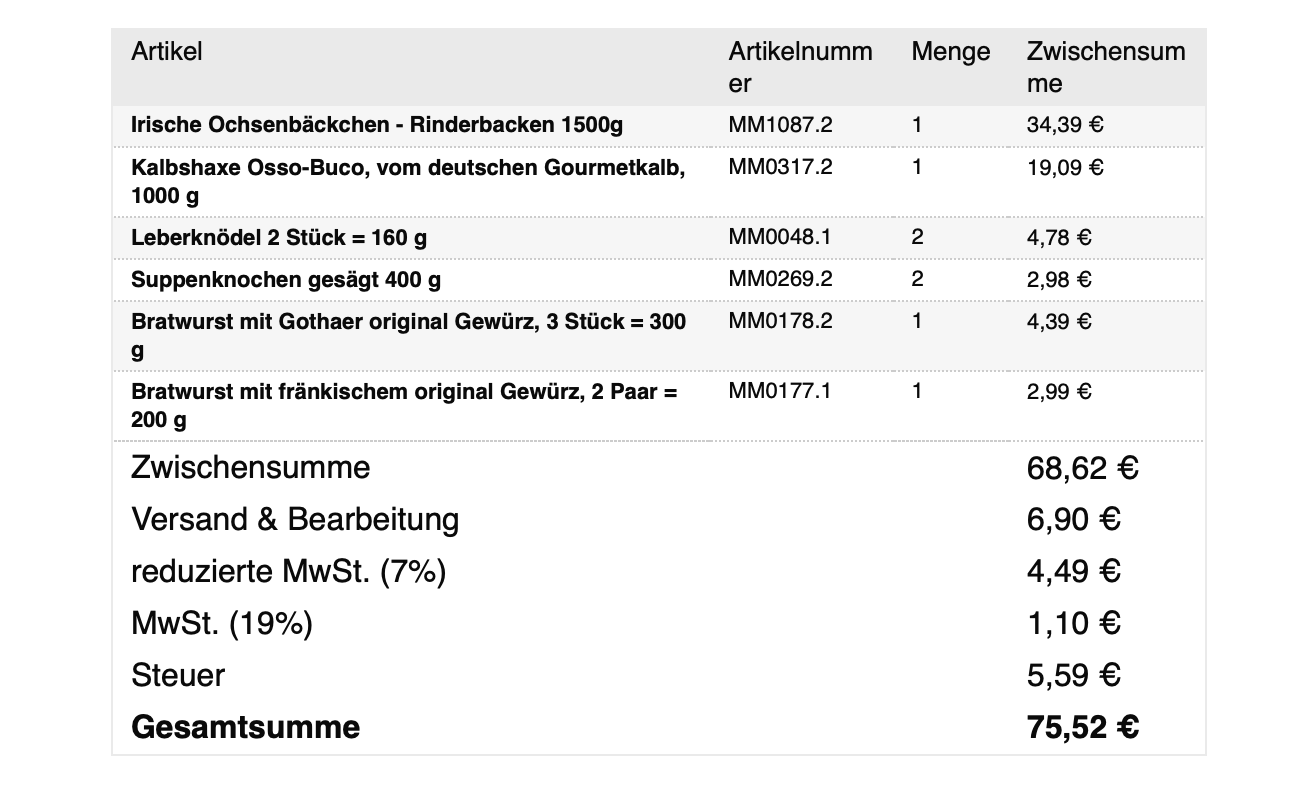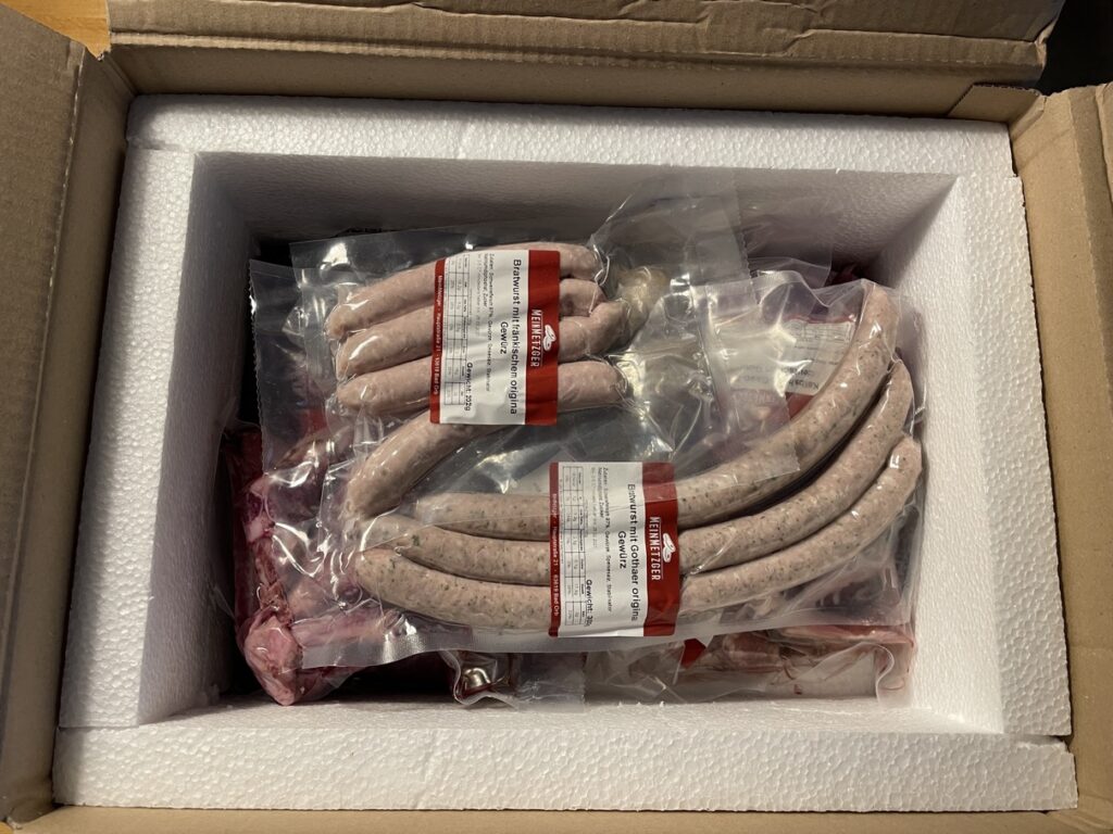 Ich bestellte Ochsenbäckchen vom Rind und Kalb, Suppenknochen, diverse Bratwürste und meine geliebten Leberknödel. gezahlt werden kann per Paypal, mit diversen Kreditkarten und auf Rechnung. Ich wählte Rechnung (Zahlungsziel 30 Tage – das ist ja sehr selten geworden).