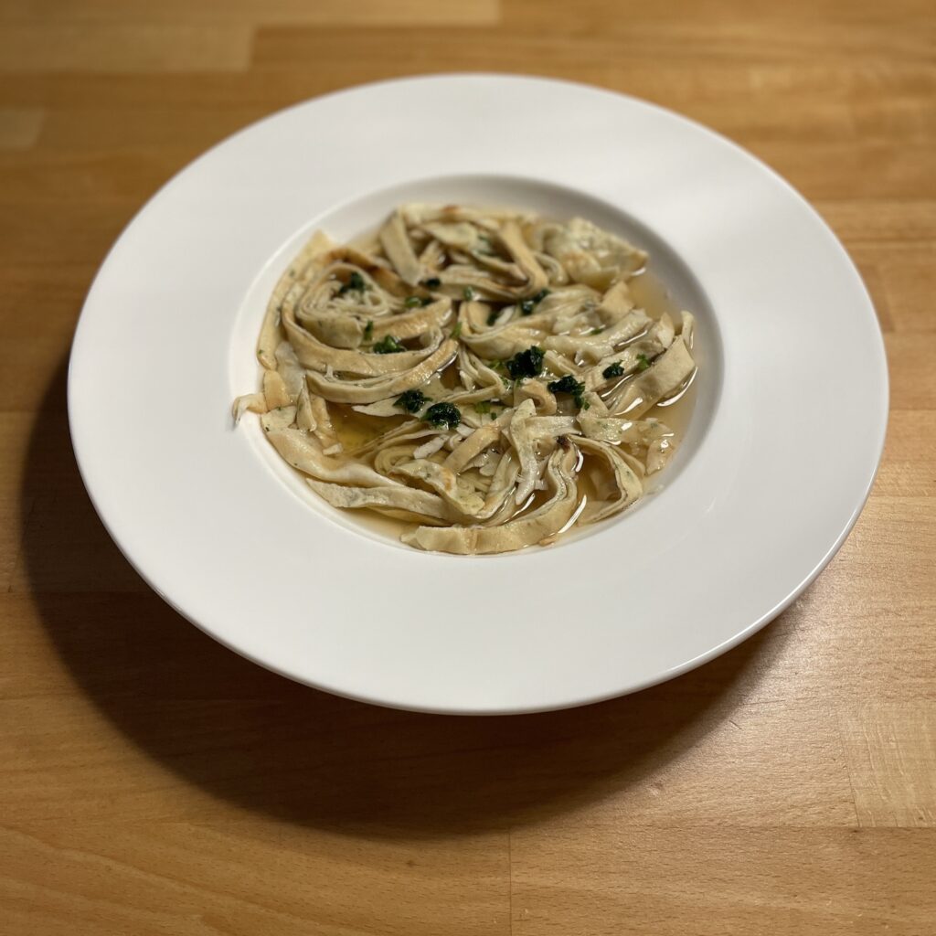Hier war ich ein wenig enttäuscht, hatte ich doch den Geschmack an die Frittatensuppe aus den Urlauben meiner Kindheit in Erinnerung. Mir war die Zusammenstellung geschmacklich etwas zu lasch, vielleicht war die Suppe auch nicht heiss genug.