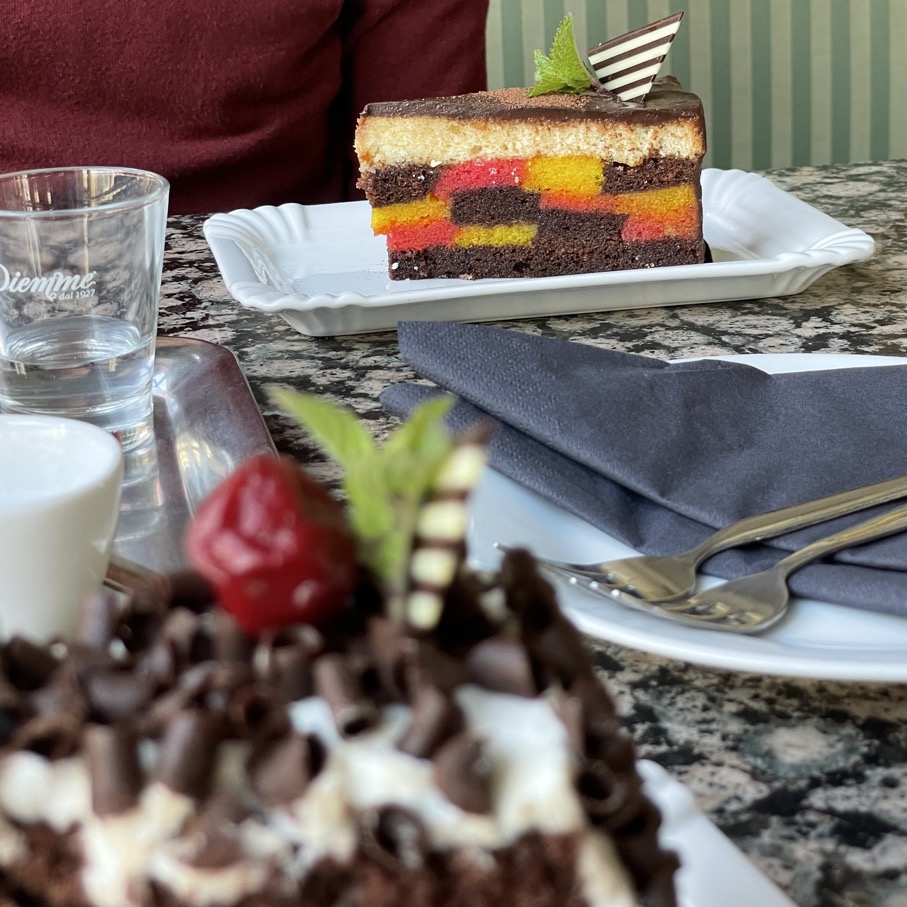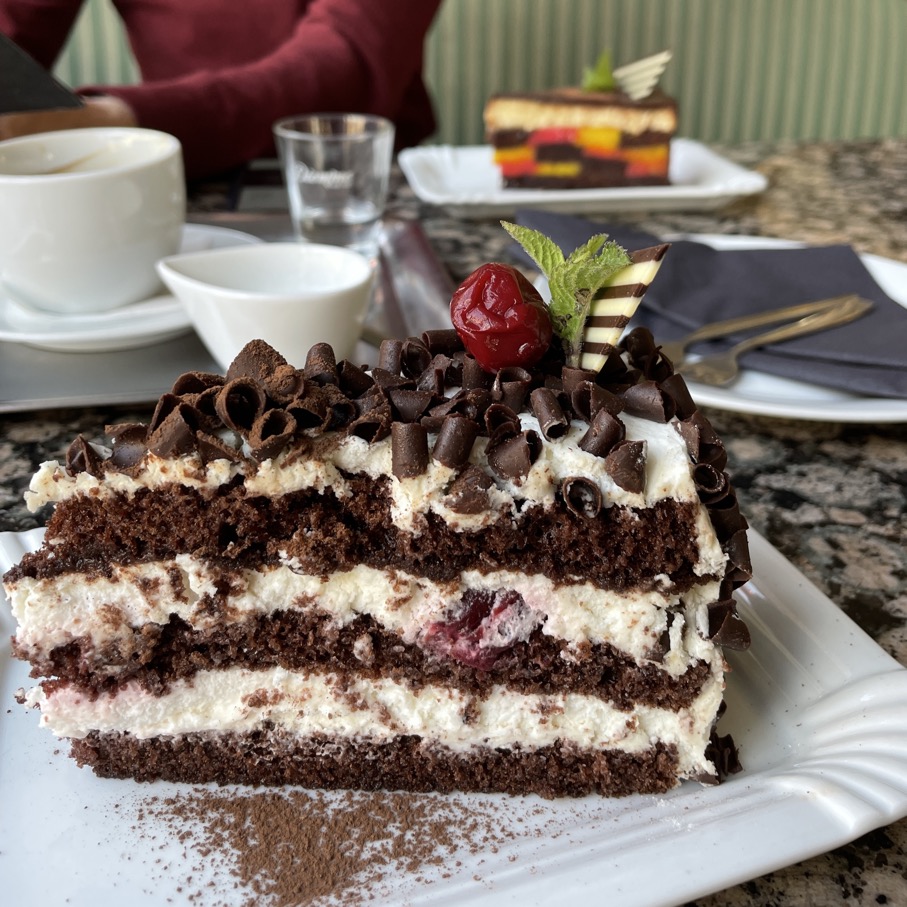 Nach einer ganzen Weile erschien ein Kellner und fragte nach den Wünschen. Wir bestellten kalte Getränke und Kuchen bzw. Torte. Die hausgemachte Limonade war lecker, die Kubisten-Torte mundete auch (im gleichen Haus gibt es eine Ausstellung zum Kubismus), die Schwarzwälder-Kirsch-Variante war nicht meines, die Sahne war eher eine Creme und ziemlich mächtig. Aber ok war halt nicht mein Geschmack.