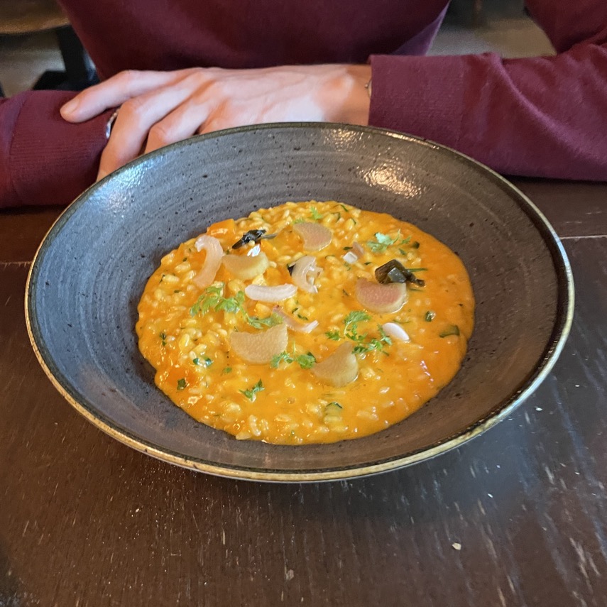 … sowie als Hauptgang ein Karotten-Risotto mit eingelegtem Rhabarber und Frühlingszwiebeln.