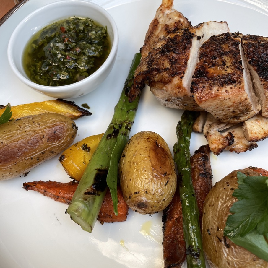 Die Begleitung hatte „olivengefüttertes“ gegrilltes Huhn mit Kartoffeln/Ofengemüse und Chimchurri