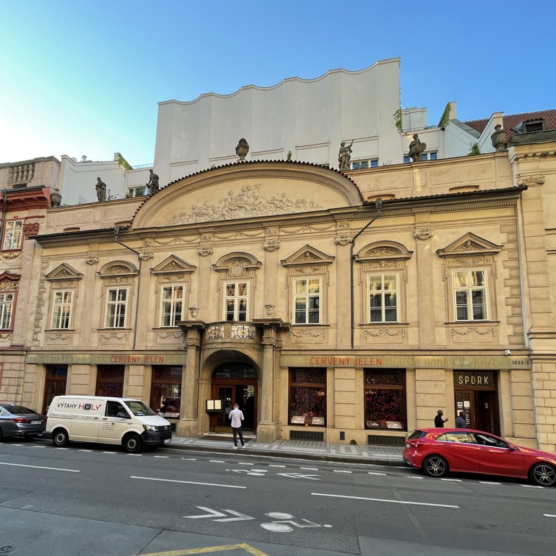 Direkt gegenüber vom Hotel liegt das Restaurant Červený Jelen – roter Hirsch.