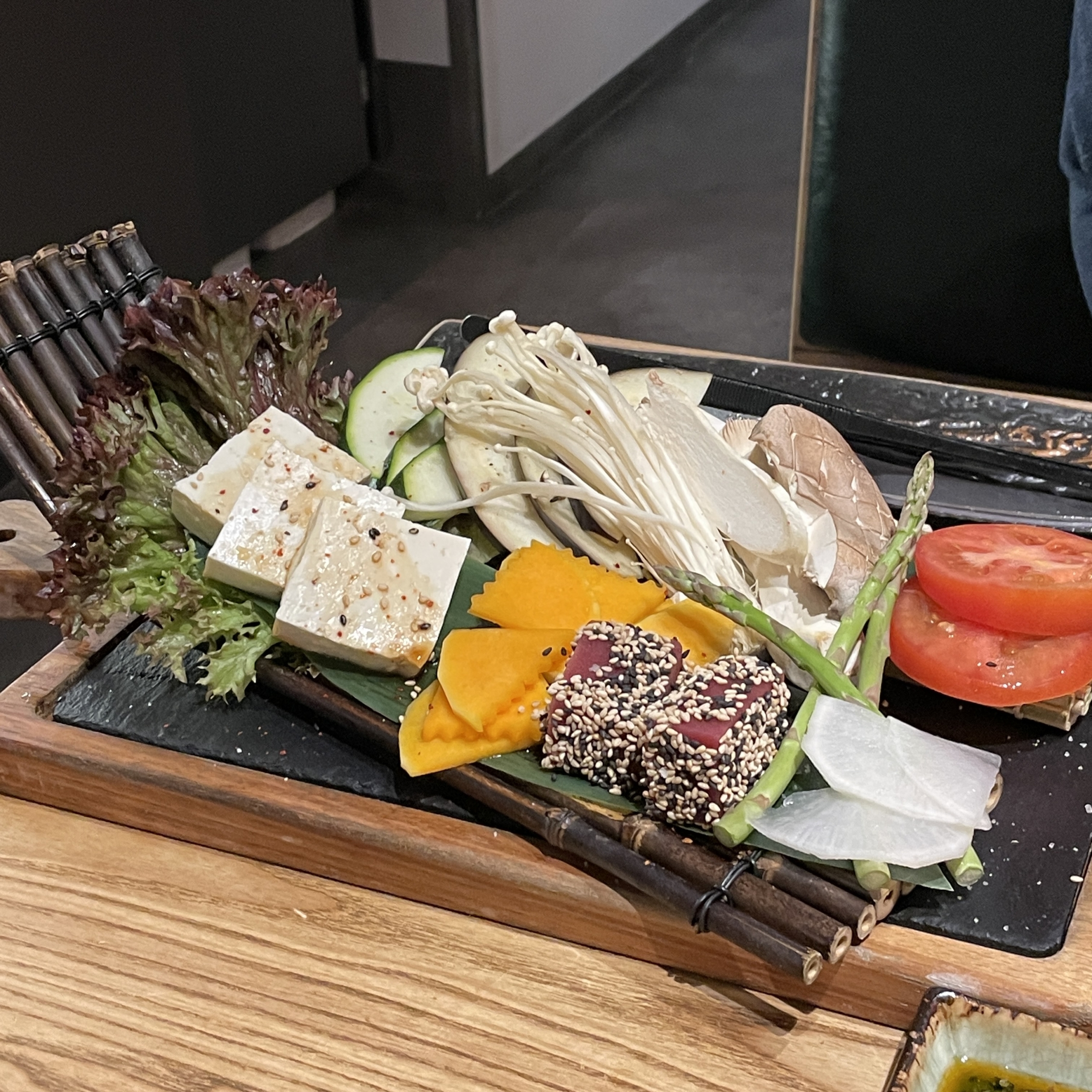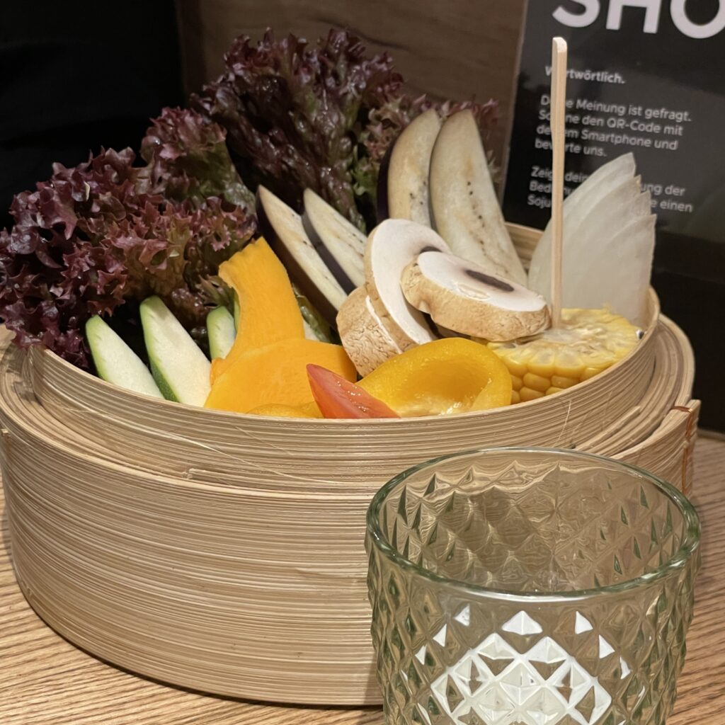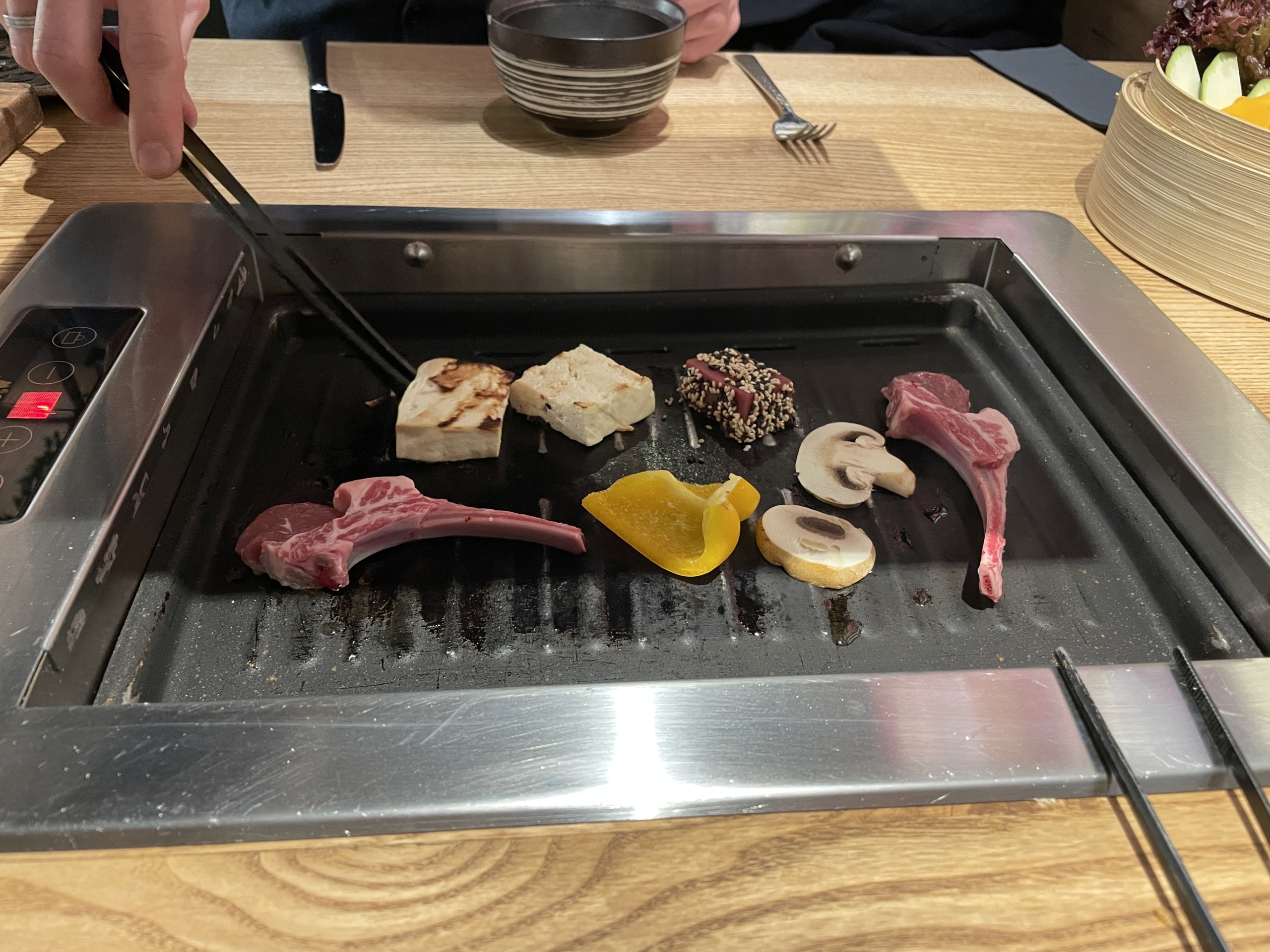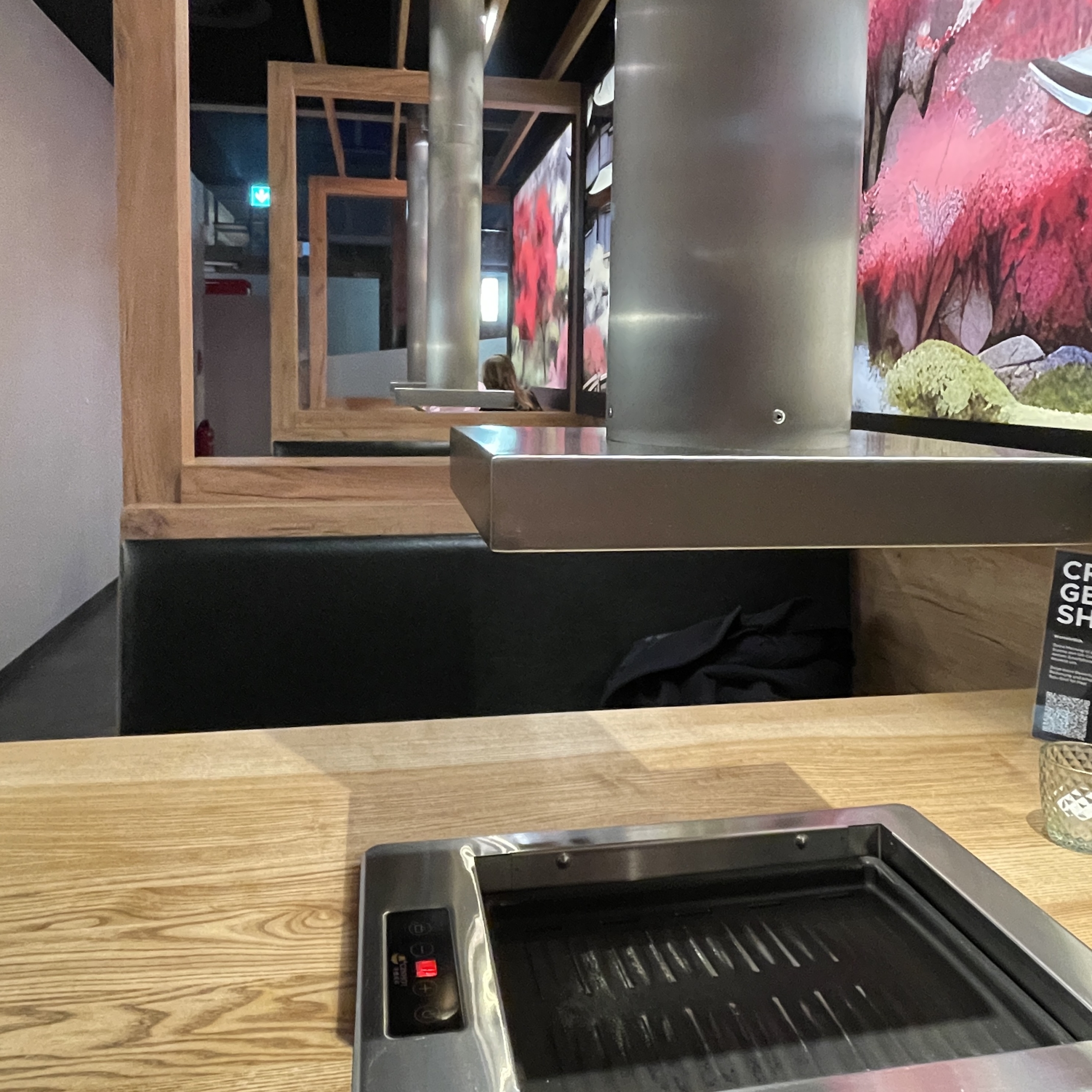 Neben normalen Tischen finden sich spezielle Grilltische an denen man sein Essen selbst „zubereitet“. Wir hatten mit zwei Personen gut Platz, mit vier Personen stelle ich mir das sehr kuschelig vor, dazu später.