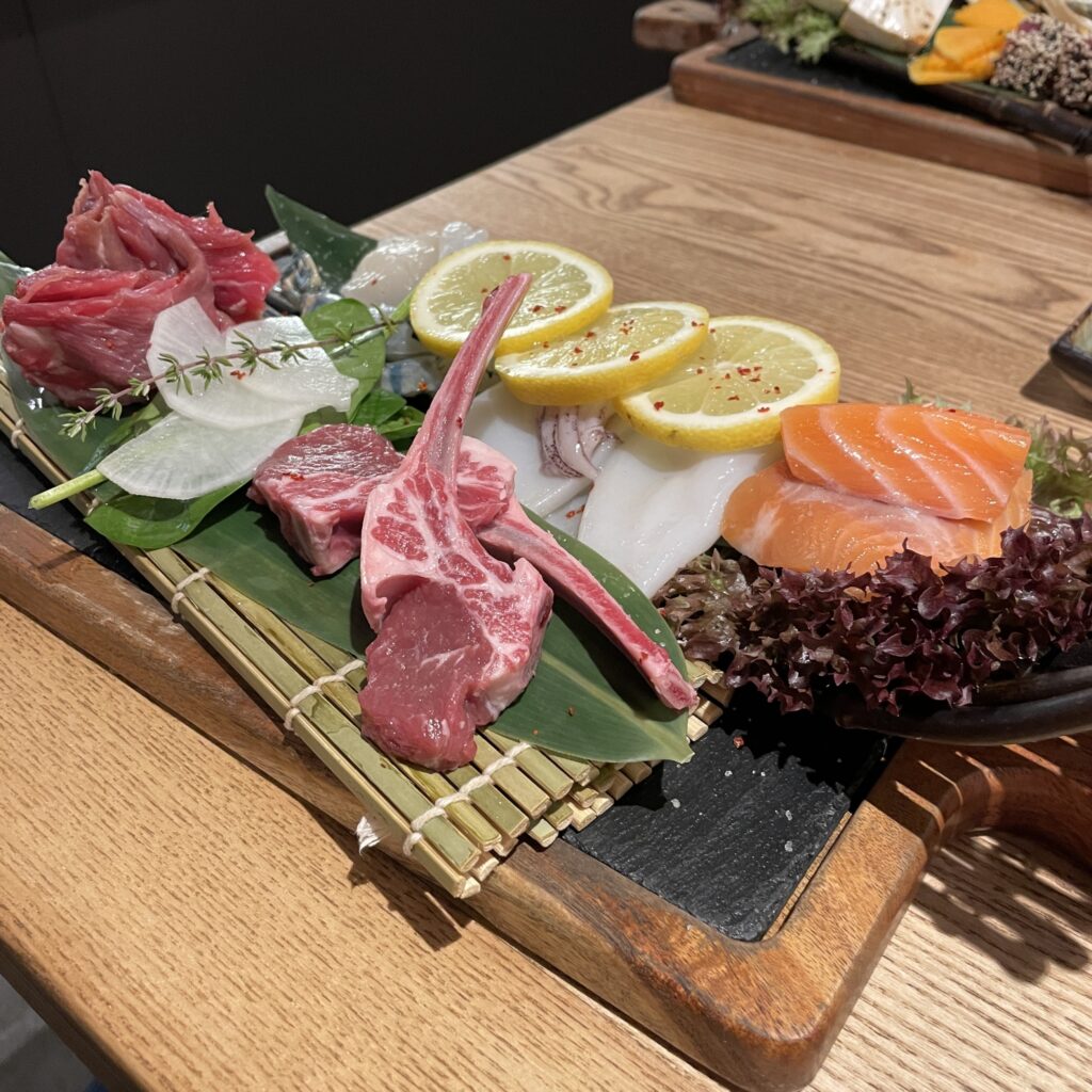 Wir bestellten aus einer wirklich sehr großen Karte (das Format ist gemeint) zwei Grillplatten und Getränke. Neben den speziellen Gerichten für den Korean BBQ finden sich auch Sushi und diverse Tellergerichte auf der Karte. Wir warteten nicht allzulange und bekamen unsere bestellten Leckereien serviert. “ Also Meeresfrüchte und Fleisch…