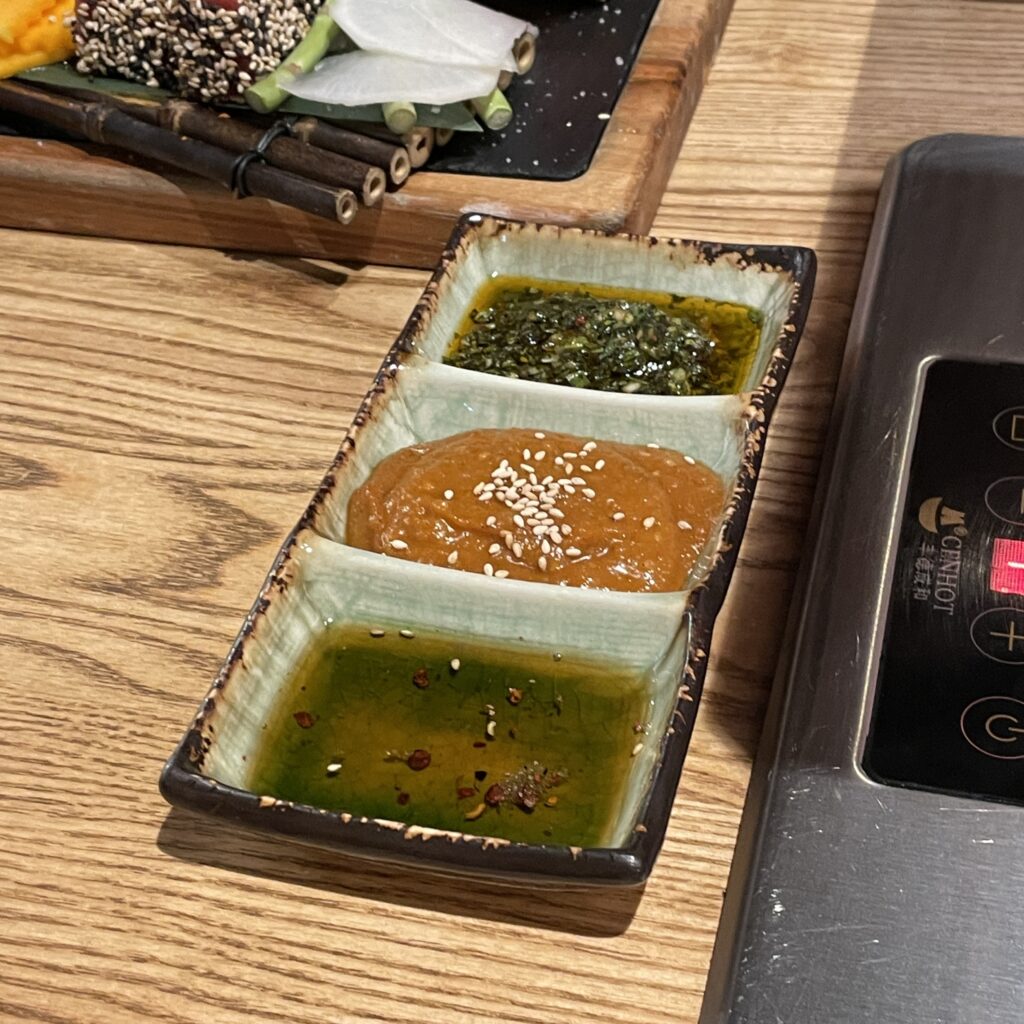 sowie drei Sößchen (Chimchurri koreanisch, ein Gewürzöl und die Paste in der Mitte muss ich noch herausbekommen) serviert