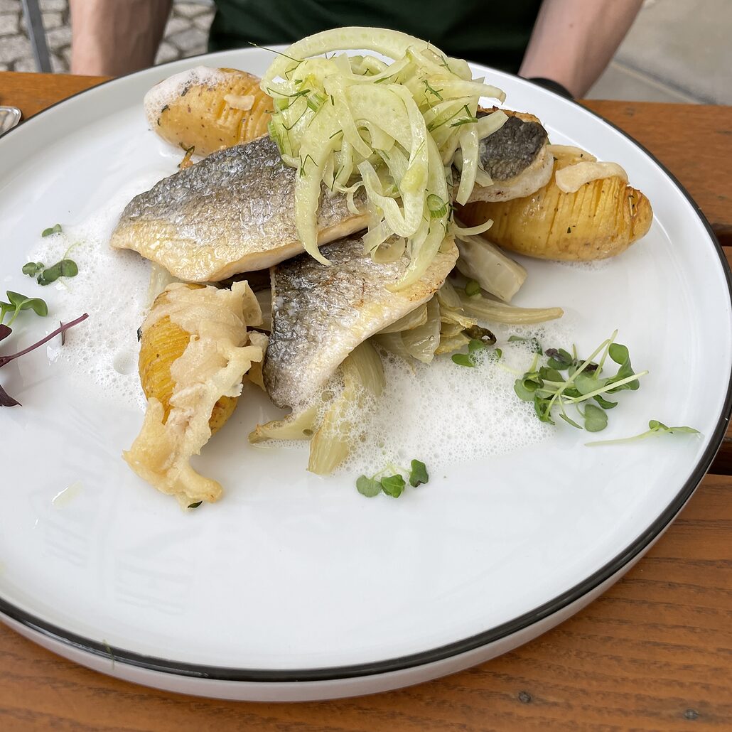 Doradenfilet auf und unter Fenchelgemüse mit Fächerkartoffeln, letztere waren noch fast roh. Insgesamt fehlte der Begleitung bei diesem Gericht die Würze. 22€