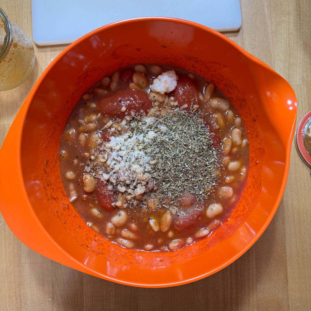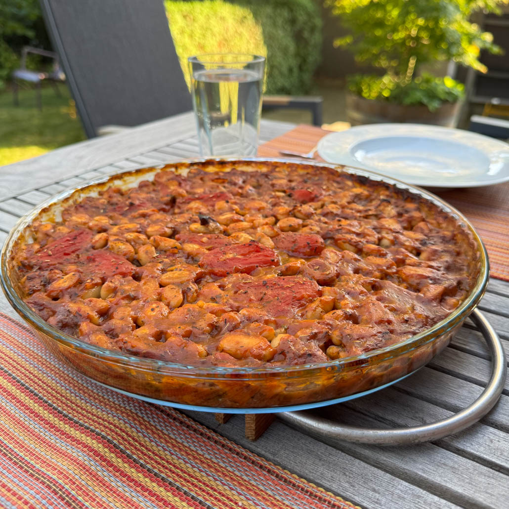 Den Doseninhalt (weisse Bohnen) in ein Sieb geben und unter klarem Wasser abspülen. Den Inhalt in eine Schüssel geben, eine Dose Tomaten der Wahl dazugeben, es ist egal ob gehackt oder ganze Tomaten. Ich habe noch ein Glas selbstgemochtes Sugo übrig, das gebe ich auch noch dazu. Mit reichlich gehackten Knoblauch (drei, vier Zehen). Salz, schwarzen Pfeffer und einer guten Portion Kräuter Provence würzen. Es gehen auch andere Kräuter, griechische Kräuter passen auch sehr gut. Das Ganze mit einem Löffel durchrühren und in eine feuerfeste Form in den Backofen stellen. Je nach Hitzeart dauert die Backzeit zwischen 35-45 Minuten, ich nehme Umluft mit Unterhitze, 180 Grad und 45 Backzeit. Dazu Baguette und einen kleinen Klecks Joghurt reichen.