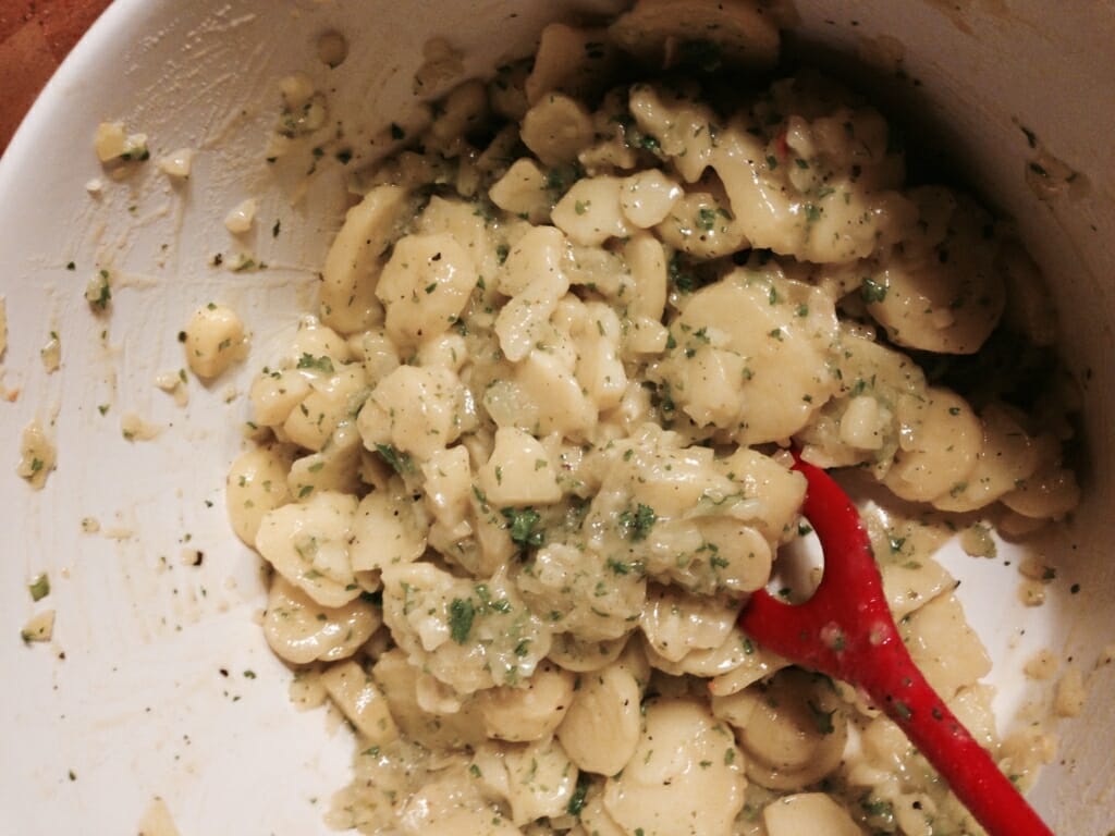Ich nehme gerne weiße Bohnen aus der Dose, man natürlich auch getrocknete Bohnen reichlich lange wässern und kochen. Ich mische gerne Riesenbohnen unter die handelsüblichen weißen Bohnen.