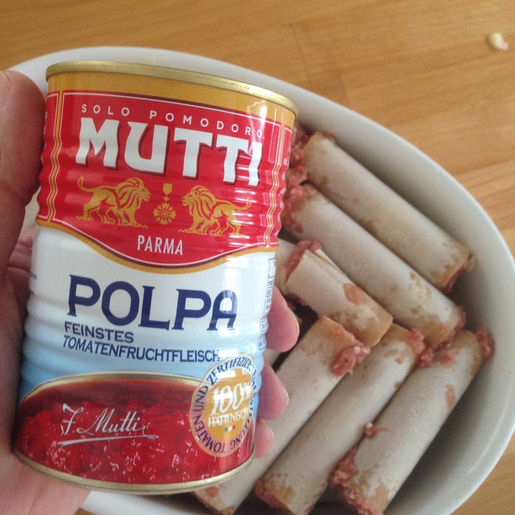 Gehackte Dosentomaten oder Pulpo nach Gusto mit Salz, Pfeffer, Oregano usw. würzen.